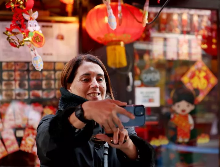 برطانیہ کے دارالحکومت لندن میں لالٹین سے سجائے گئے  چائنہ ٹاون میں ایک خاتون سیلفی لے رہی ہے۔(شِنہوا)