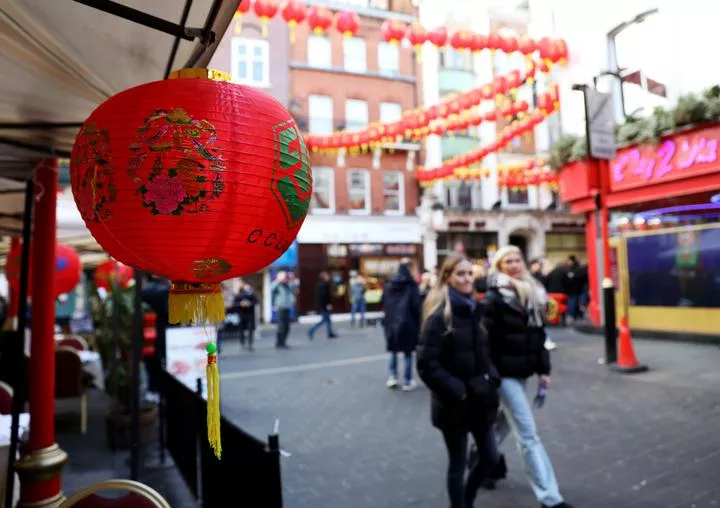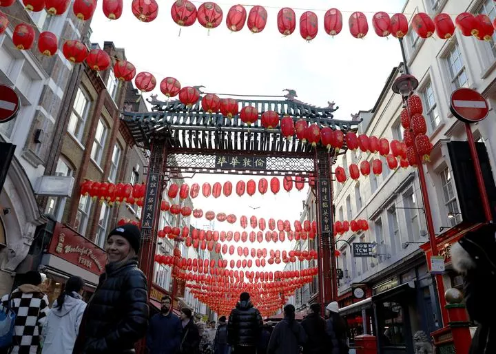 برطانیہ کے دارالحکومت لندن میں لالٹین سے سجے چائنہ ٹاون کا ایک منظر۔(شِنہوا)