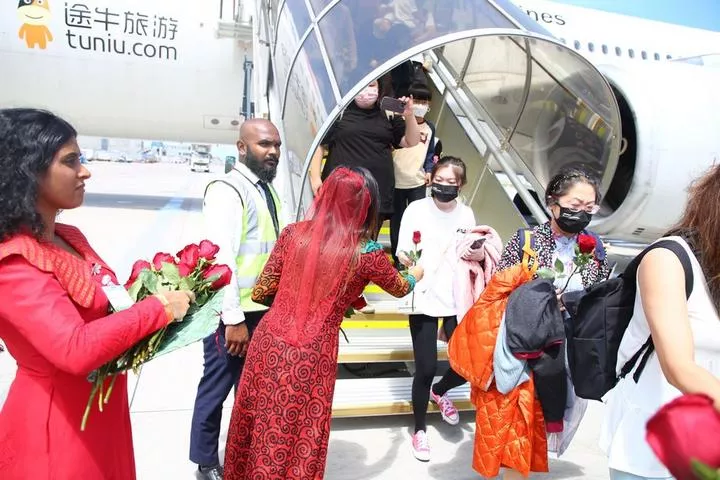 کیپیٹل ایئر لائنز کی پرواز 190 سے زائد چینی سیاحوں کو لیکر ویلانا بین الاقوامی ہوائی اڈے پر اتری تو چینی سفیر وانگ لی شین، مالدیپ کے وزیر سیاحت عبداللہ معصوم اور دیگر حکام نے خیرمقدم کیا۔