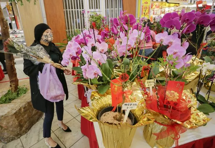 کینیڈا کے برٹش کولمبیا کے رچمنڈ میں چینی قمری سال نو پر پھولوں اور تحائف کی نمائش میں ایک خاتون پھول خرید رہی ہے۔(شِنہوا)