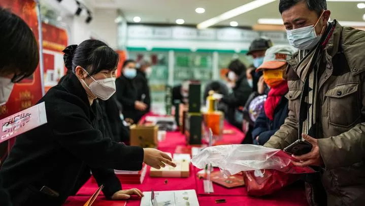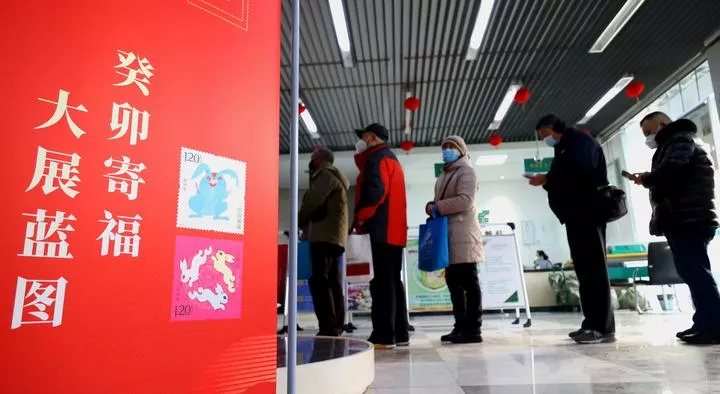 چین، مشرقی صوبہ جیانگ سو کے شہر لیان یون گانگ کے ضلع ہائی ژو کے ایک ڈاک خانے میں لوگ  خرگوش کے سال پر جاری کردہ خصوصی ڈاک ٹکٹ حاصل کرنے کےلئے قطار میں کھڑے ہیں۔ (شِنہوا)