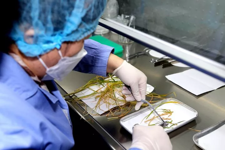 چین کے دارالحکومت بیجنگ میں چائنیز اکیڈمی آف سائنسز (سی اے ایس) کے سنٹر فار ایکسی لینس ان مالیکیولر پلانٹ سائنسز کی محقق ژینگ ہوئی چھیونگ سی اے ایس کے ماتحت خلائی استعمال کیلئے ٹیکنالوجی و انجینئرنگ کے مرکزکی بائیولوجی لیب میں چین کے تیان گونگ خلائی اسٹیشن سے آنیوالے چاول کے نمونوں پر کام کر رہی ہے۔(شِنہوا)