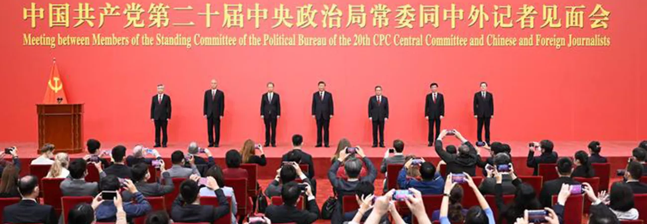 چین، دارالحکومت بیجنگ کے عظیم عوامی ہال میں میٹ دی پریس میں کمیونسٹ پارٹی آف چائنہ کی مرکزی کمیٹی کے جنرل سیکرٹری شی جن پھنگ اور کمیونسٹ پارٹی آف چائنہ کی 20 ویں مرکزی کمیٹی کے سیاسی بیورو کی قائمہ کمیٹی کے نئے منتخب ارکان لی چھیانگ، ژاؤ لی جی، وانگ ہوننگ ، چھائی چھی، ڈنگ شوئے شیانگ اور لی شی موجود ہیں۔ (شِنہوا)