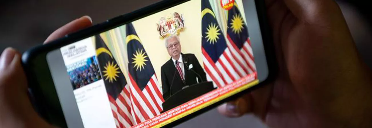 ملائیشیا کے کوالالمپور میں ایک شخص اپنے موبائل فون پر وزیراعظم اسماعیل صابری یعقوب کا خطاب سن رہا ہے۔ملائیشیا کے وزیراعظم نے پارلیمنٹ تحلیل کرنے کا اعلان کیا ہے۔(شِنہوا)
