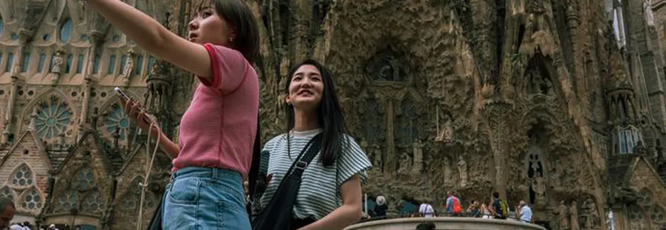 سپین کے شہر بارسلونا میں واقع ساگراڈا فیمیلیا چرچ کے باہر چینی سیاحوں کا تصویر کے لیے انداز۔ (شِنہوا)