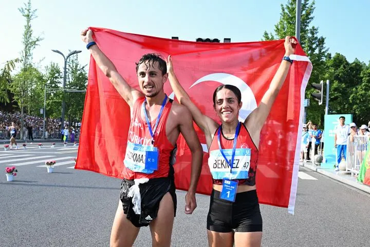 چین کے صوبہ سیچھوان کے شہرچھنگ دو میں31 ویں ایف آئی ایس یوسمرورلڈ یونیورسٹی گیمزمیں مردوں کے ایتھلیٹکس 20 کلومیٹر ریس واک کے فائنل کے بعد ترکیہ کے صالح کورکماز (بائیں) اورمیریم بیکمیزخوشی کا اظہار کر رہے ہیں۔(شِںہوا)
