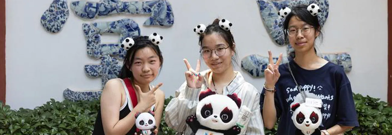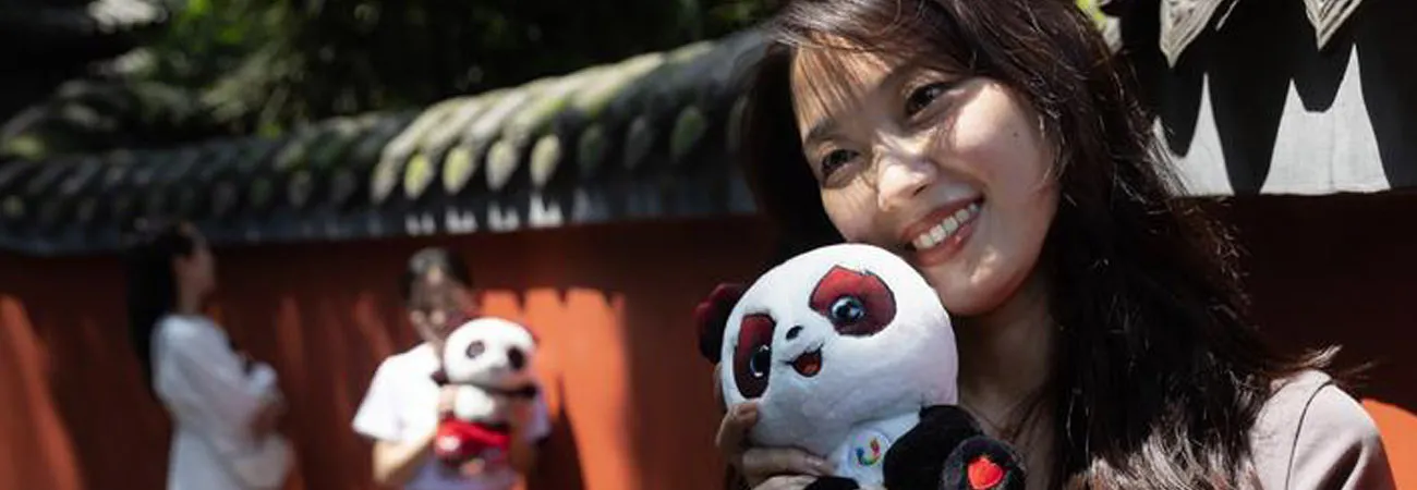 چین ، جنوب مغربی صوبے سیچھوان کے شہر چھنگ ڈو میں سیاحوں کا چھنگ ڈو یونیورسٹی کھیلوں کے ما سکوٹ رونگ باؤ کے ساتھ تصاویر کے لئے انداز۔ (شِنہوا)