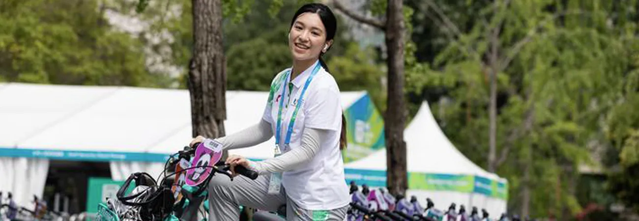 چین ، جنوب مغربی صوبے سیچھوان کے شہر چھنگ ڈو میں ایک رضاکار چھنگ ڈو یونیورسٹی کھیلوں کے لئے خاص طور پر تیار کردہ شیئرڈ بائیک چلارہی ہے۔ (شِنہوا)
