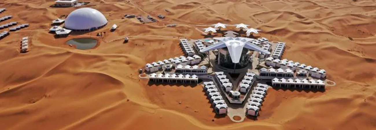 چین کے شمال مغربی  ننگشیا ہوئی خودمختارعلاقے کے ژونگ وی میں شاپوتو کےقدرتی مقام میں صحرائے تینگرمیں ایک ریزورٹ کا منظر۔(شِنہوا)