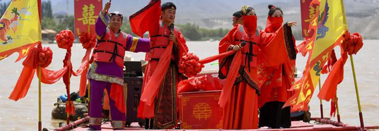 چین کے شمال مغربی ننگشیا ہوئی خودمختارعلاقے کےژونگ وی میں شاپوتو کےقدرتی مقام پراداکاربھیڑ کی کھال سے بنے بیڑے پرشادی کی تقریب میں فن کا مظاہرہ کر رہے ہیں۔(شِنہوا)