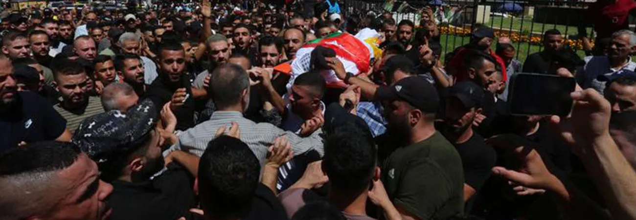 مغربی کنارے کے شہر نابلس میں اسرائیلی فوجیوں کے ساتھ جھڑپوں میں جاں بحق ہونے والے فلسطینی کی نماز جنازہ میں لوگ شریک ہیں۔(شِنہوا)