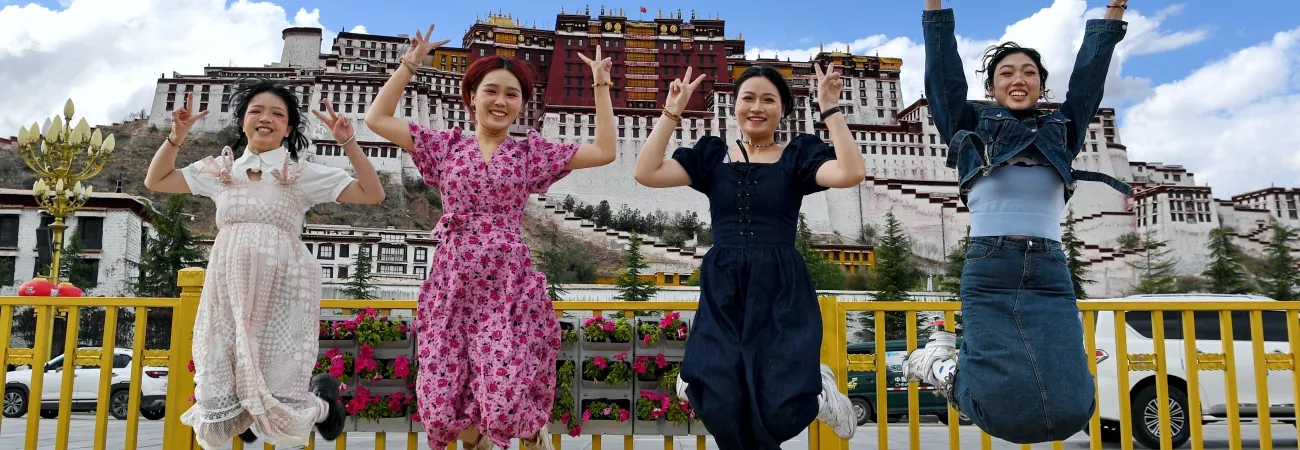چین ، جنوب مغربی تبت خوداختیار خطے کے صدرمقام لہاسا میں پوٹالا پیلس کے احاطے میں خواتین سیاحوں کا تصاویر کے لئے ایک انداز ۔(شِنہوا)