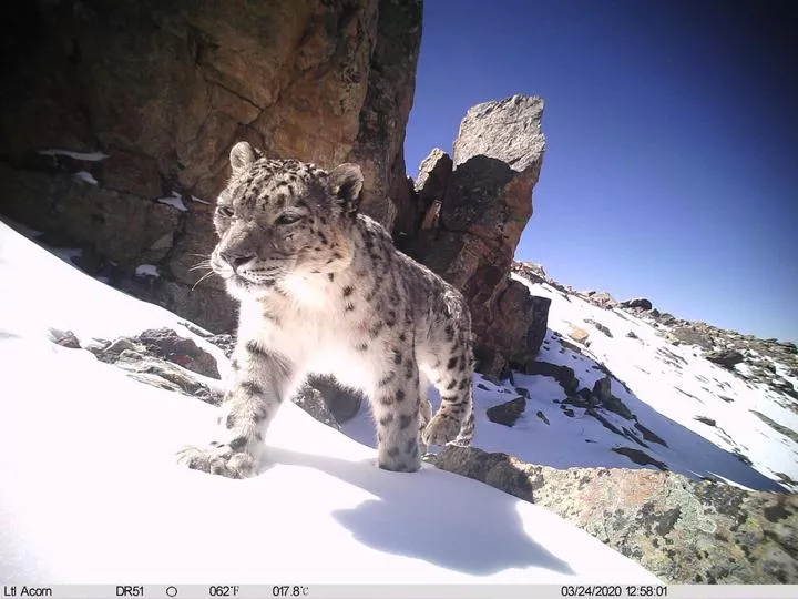 چین ، جنوب مغربی تبت خوداختیارعلاقے کے چھومولانگ ما پہاڑی افزائش گاہ میں ایک برفانی چیتا دیکھا جاسکتا ہے۔ (شِنہوا)