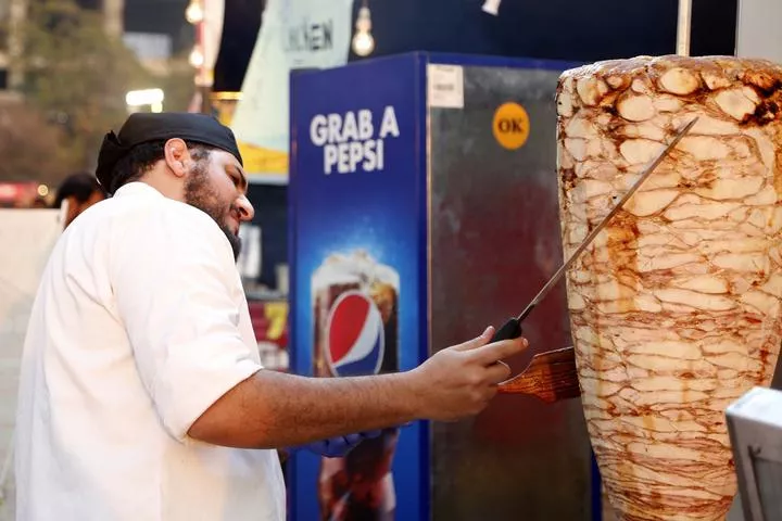 اسلام آباد، 3 روزہ خوراک میلے کے دوران ایک باورچی شوارما تیار کررہا ہے۔ (شِنہوا)