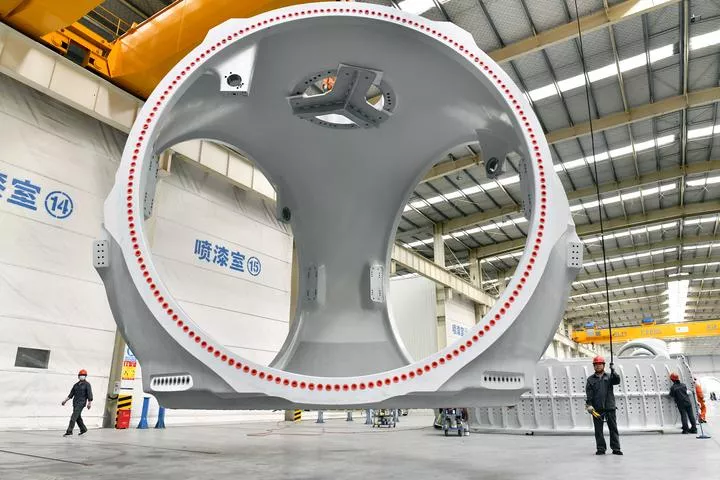 چین ، مشرقی صوبہ شان ڈونگ کی کاؤنٹی ہوئی من کے ونڈ پاور ایکوپمنٹ انڈسٹریل بیس کی ایک ورکشاپ میں عملہ کام کررہا ہے۔ (شِنہوا)