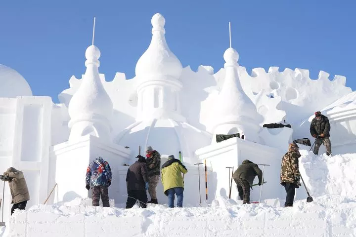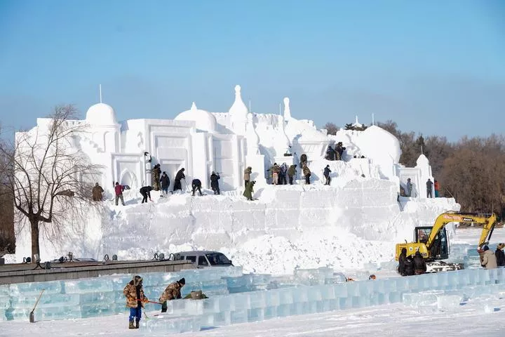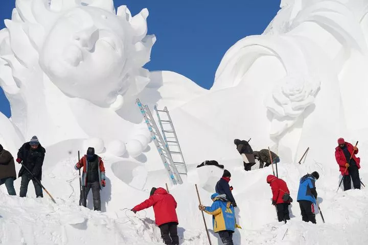 چین کے شمال مشرقی صوبہ حئی لونگ جیانگ کے ہاربن میں عملہ کے اراکین برفانی مجسموں کی 35 ویں تائی یانگ داؤ آئلینڈ بین الاقوامی نمائش کیلئے ایک دیوقامت برفانی مجسمہ تیار کر رہے ہیں۔(شِنہوا)