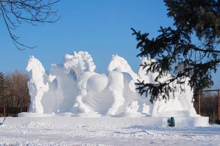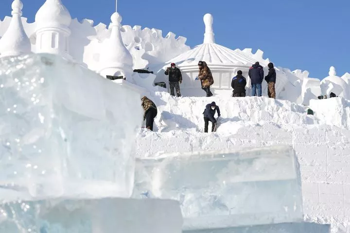 چین کے شمال مشرقی صوبہ حئی لونگ جیانگ کے ہاربن میں عملہ کا ایک رکن برفانی مجسموں کی 35 ویں تائی یانگ داؤ آئلینڈ بین الاقوامی نمائش کیلئے ایک دیوقامت برفانی مجسمے کو حتمی شکل دے رہا ہے۔(شِنہوا)