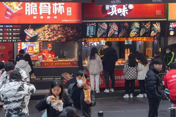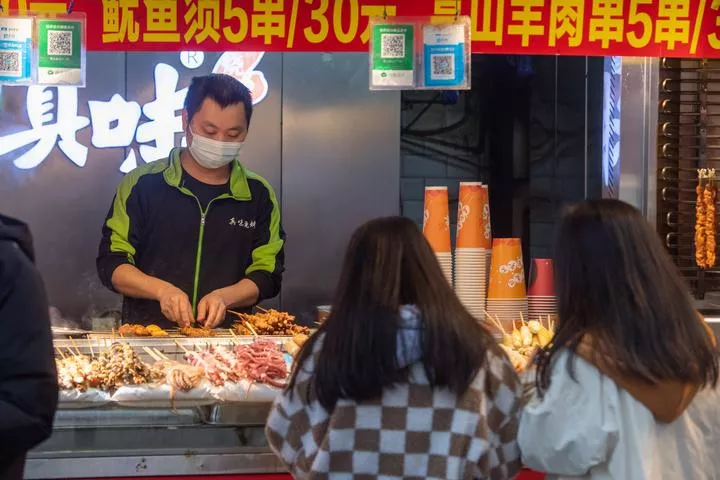 چین، جنوب مغربی چھونگ چھنگ کے جی فینگ بے کاروباری ضلع میں سیاح مقامی پکوان چکھ رہے ہیں ۔(شِنہوا)