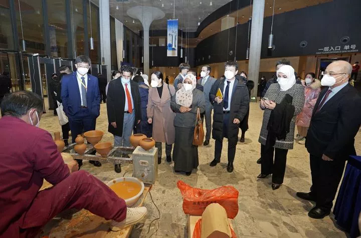 چین، مشرقی صوبہ جیانگ شی کے شہر جینگ ڈی ژن میں 5 ویں عرب فنون میلے میں مہمان غیر مادی ثقافتی ورثہ دیکھ رہے ہیں۔ (شِنہوا)