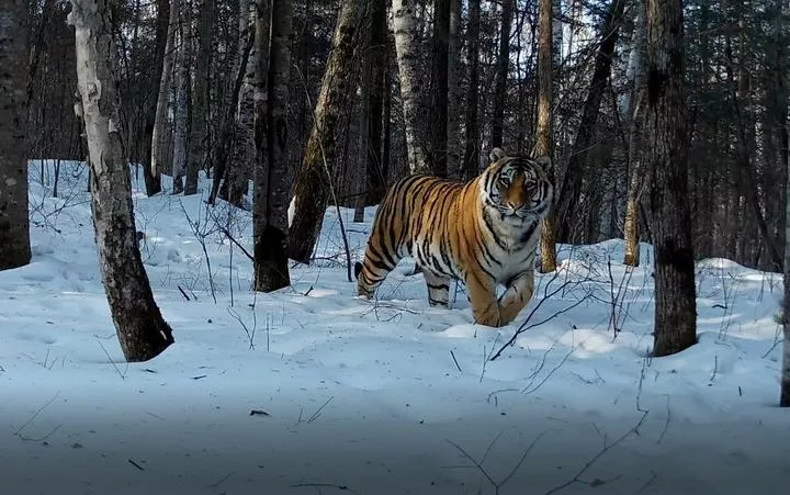چین ، شمال مشرقی صوبہ جیلن کے تیان چھیاؤ لنگ جنگل میں انفراریڈ نگراں کیمرے سے بنائی گئی تصویر میں سائبرین جنگلی شیر کو دیکھا جاسکتا ہے۔ (شِنہوا)
