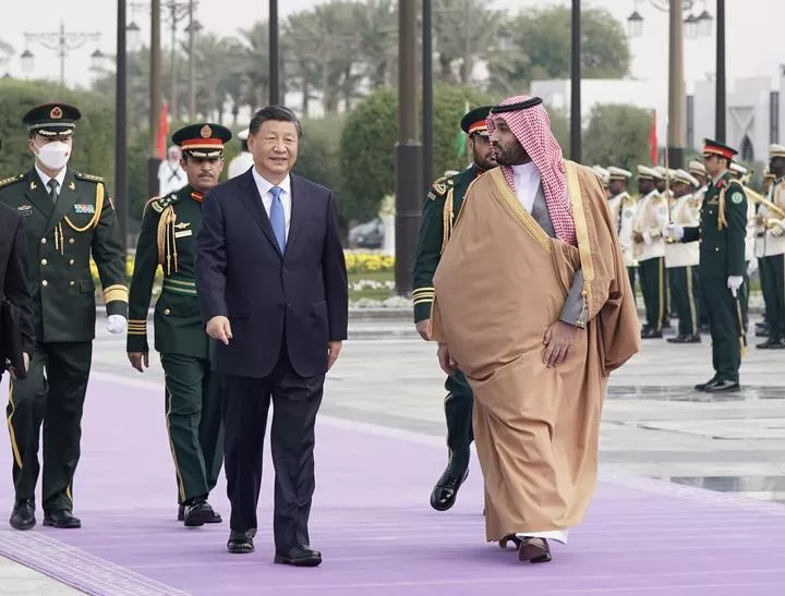 شی نے سعودی ولی عہد کے ساتھ گارڈ آف آنر کا معائنہ لیا ۔ روایتی انداز میں تلوار اٹھائے گارڈز نے چینی صدر کا پرتپاک استقبال کیا۔