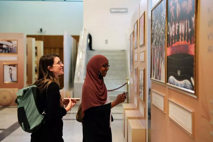 سعودی عرب، ریاض میں خواتین چین اور عرب ممالک کے درمیان دوستانہ تبادلے اور تعاون کی عکاسی کرتی تصویری نمائش دیکھ رہی ہیں ۔ (شِنہوا)