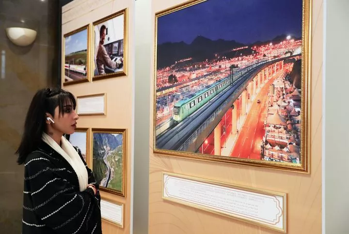سعودی عرب، ریاض میں ایک خاتون چین اور عرب ممالک کے درمیان دوستانہ تبادلے اور تعاون کی عکاسی کرتی تصویری نمائش دیکھ رہی ہے۔ (شِنہوا)