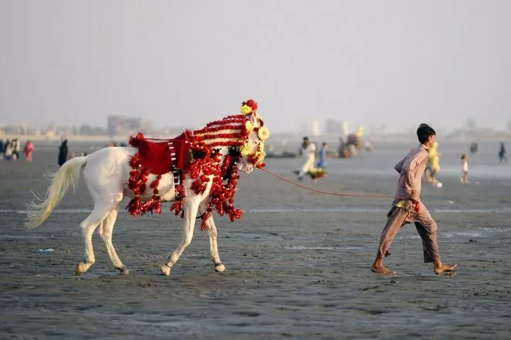 کراچی، کلفٹن کے ساحل پر ایک شخص اپنے گھوڑے کے ساتھ چہل قدمی کررہا ہے۔ (شِنہوا)