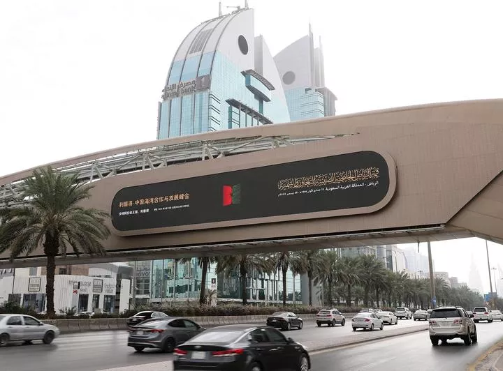 سعودی عرب، ریاض میں چین ۔عرب ممالک سربراہ اجلاس بارے ایک اشتہار کو دیکھا جاسکتا ہے۔ (شِنہوا)