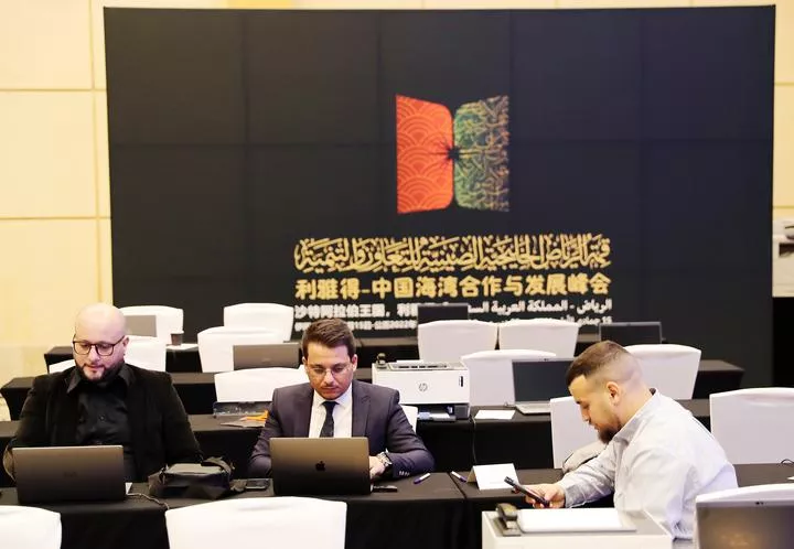 سعودی عرب، ریاض میں چین ۔ خلیج تعاون کونسل سربراہ اجلاس کے میڈیا مرکز میں صحافی کام کررہے ہیں۔(شِنہوا)