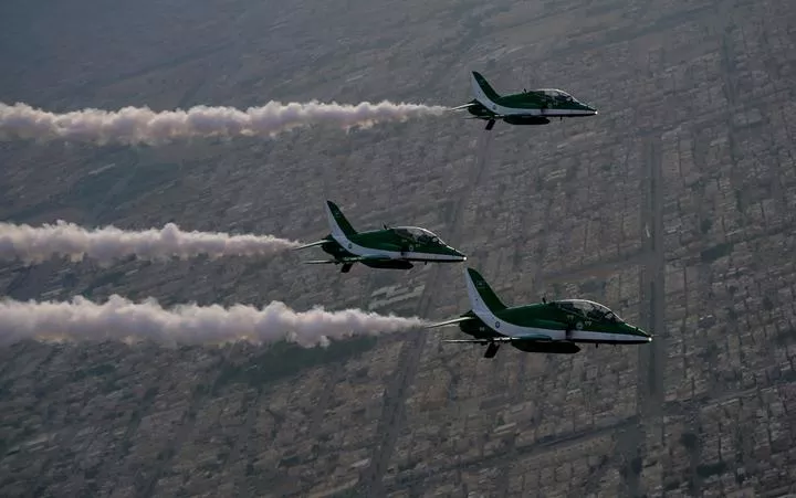سعودی عرب، سعودی طیارے چین کے قومی پرچم کے رنگوں کا دھواں ریاض کے آسمان پرچھوڑرہے ہیں ۔ (شِنہوا)