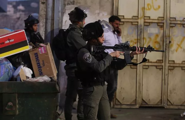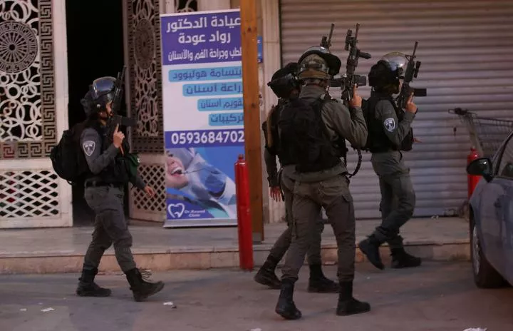 مغربی کنارے کے شہر نابلس کے جنوبی قصبے حوارہ میں اسرائیلی سرحدی پولیس کے اہلکار فلسطینی شہری کے جائے قتل کے نزدیک موجود ہیں۔(شِنہوا)
