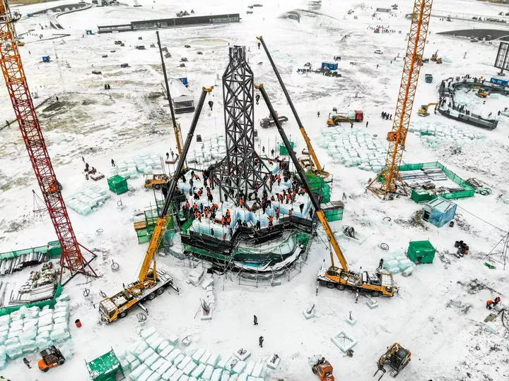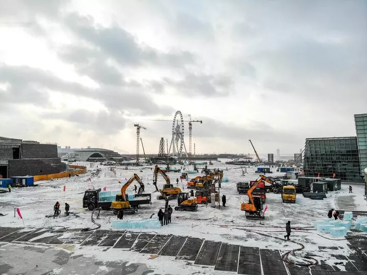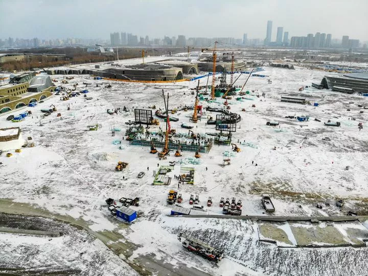 چین ، شمال مشرقی صوبہ حئی لونگ جیانگ کے شہر ہاربن میں واقع ہاربن آئس سنو ورلڈ کے تعمیراتی مقام کا ایک منظر۔ یہ معروف تھیم پارک ہر سال موسم سرما میں کھولا جاتا ہے۔ (شِنہوا)