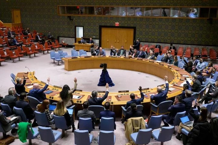 نیویارک ، اقوام متحدہ ہیڈکوارٹرز میں سلامتی کونسل اجلاس کے دوران مندوبین کی ووٹنگ کا ایک منظر۔(شِنہوا)