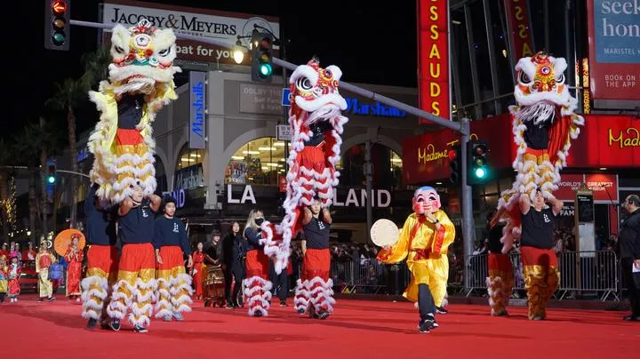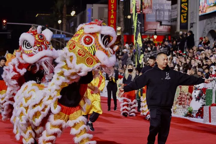امریکہ کے لاس اینجلس میں 90 ویں ہالی ووڈ کرسمس پریڈ میں چینی شیر کے رقص کا مظاہرہ کیا جا رہا ہے۔(شِنہوا)