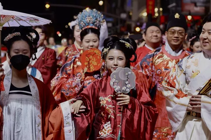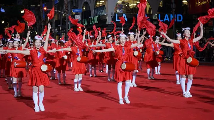 امریکہ کے لاس اینجلس میں فنکار روایتی چینی ملبوسات پہنے 90 ویں ہالی ووڈ کرسمس پریڈ میں شریک ہیں۔(شِنہوا)