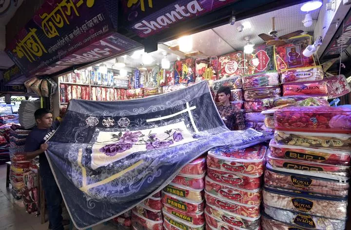 بنگلہ دیش، ڈھاکہ کی مارکیٹ میں دکاندار ایک گاہگ کو چینی کمبل دکھارہے ہیں۔(شِنہوا)
