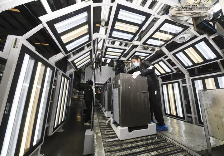 چین ، جنوب مغربی چھونگ چھنگ کی ایک فیکٹری میں عملہ واشنگ مشینز کا معیار چیک کررہا ہے۔ (شِنہوا)