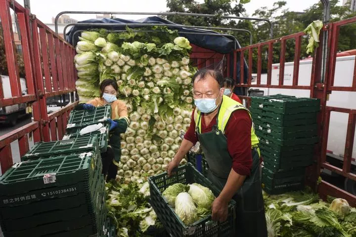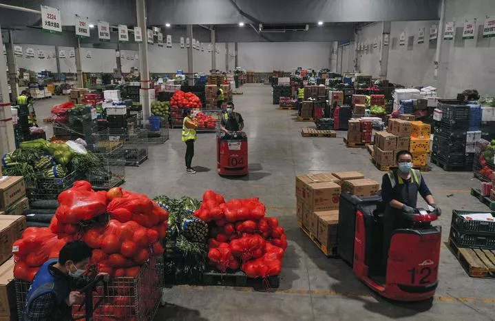 چین ، جنوب مغربی چھونگ چھنگ کی ایک لاجسٹک کمپنی کے گودام میں مزدور سبزیوں اور پھلوں کو اٹھا ئے ہو ئے ہیں۔ (شِنہوا)