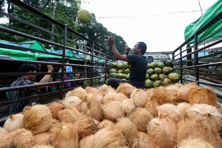 میانمار، ینگون میں کیلے اور ناریل کی تھوک مارکیٹ بگیار گھاٹ میں مزدور ناریل لیکر جارہے ہیں ۔ (شِنہوا)