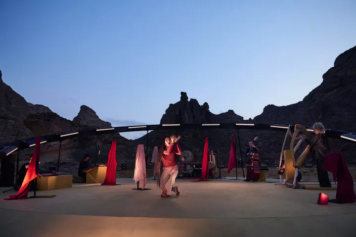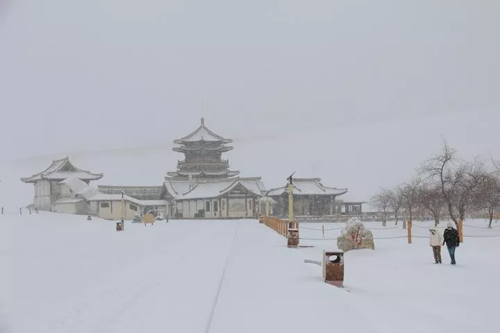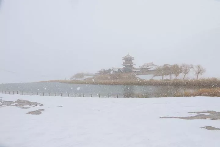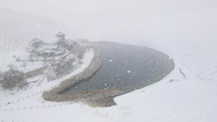 چین کے شمال مغربی صوبہ گانسو کے شہر دنہوانگ میں سیاحتی مقام منگشا پہاڑ اورکریسنٹ اسپرنگ میں برفباری کا ایک منظر۔(شِنہوا)