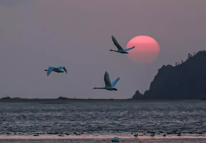 چین کے مشرقی صوبہ شان ڈونگ میں رونگ چھینگ کے قصبے چھینگ شان کی ایک ویٹ لینڈ کے اوپر ہوپر ہنس پرواز کر رہے ہیں۔(شِنہوا)