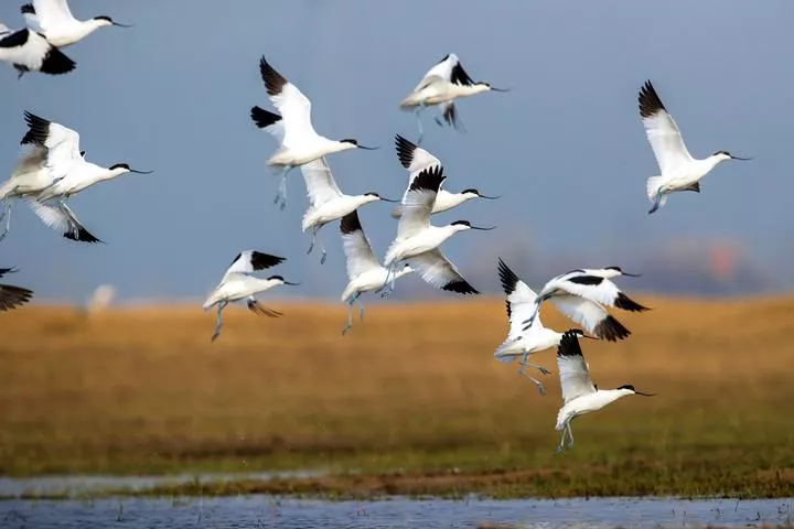 چین کے مشرقی صوبہ شان ڈونگ کے شہر لِن یی کی کاؤنٹی تان چھینگ میں پائیڈ ایووسیٹس کا ایک غول دریائے یی ہی کے ماتو سیکشن پر پرواز کر رہا ہے۔(شِنہوا)