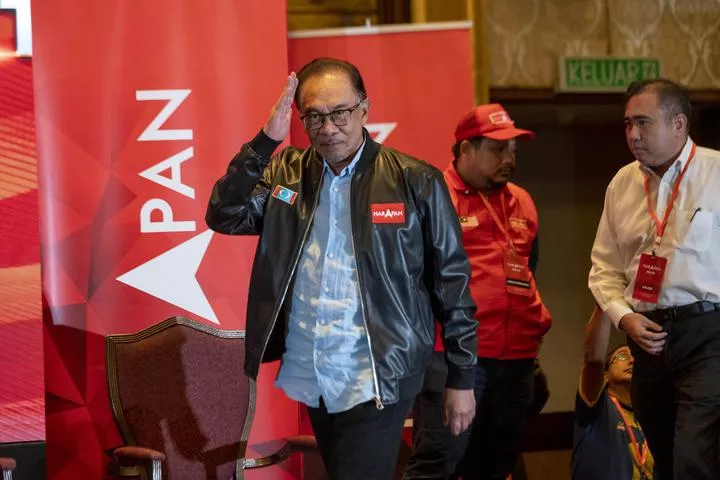 روایتی مالائی لباس میں ملبوس پاکٹن ہڑپن (پی ایچ) اتحاد کے سربراہ انور ابراہیم نے قومی محل سے براہ راست نشر ہونیوالی ایک تقریب میں ملائیشیا کے بادشاہ سلطان عبداللہ سلطان احمد شاہ کے سامنے ملک اور عوام کی بھرپور خدمت کرنے کا عہد کیا۔