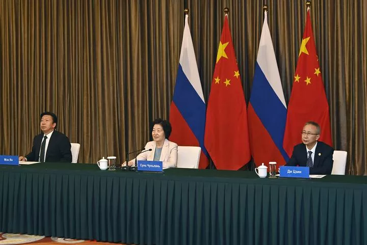 چین کی نائب وزیراعظم سن چون لان اور روس کی نائب وزیراعظم تاتیانہ گولیکوف (تصویر میں موجود نہیں) چین ۔ روس کمیٹی برائے انسانی تعاون کے 23 ویں اجلاس میں بذریعہ ویڈیو لنک شرکت کررہی ہیں۔(شِنہوا)