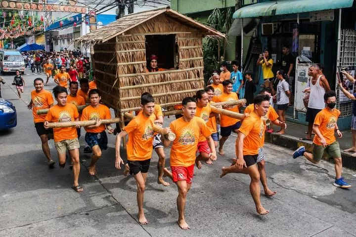 فلپائن کے پسیگ شہر میں بو ہات کو بو (نیپا ہٹ کیر ئینگ )ریس کے دوران شہر ی نیپا کھجور کے درختوں سے بنے گھر کو اٹھا ئے دوڑ رہے ہیں۔(شِنہوا)