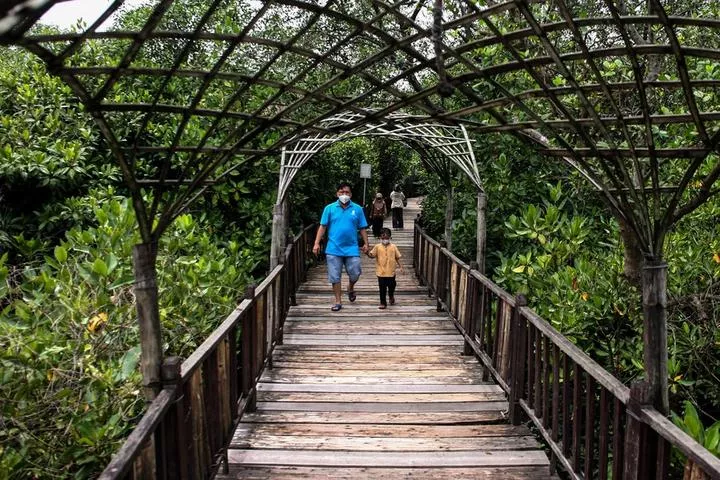 انڈو نیشیا، سورا با یا میں ایکو ٹوارزم مینگروو وونو ریجو کی ویٹ لینڈ پا رک میں مقامی سیاح کشتی رانی کر رہے ہیں۔(شِنہوا)