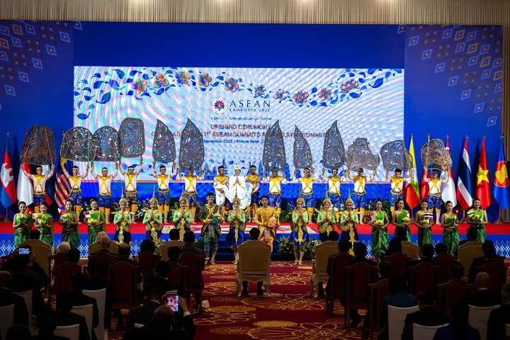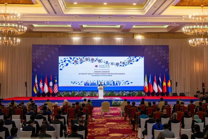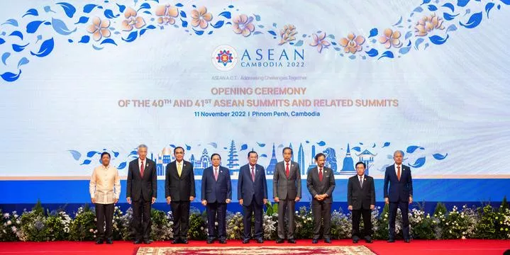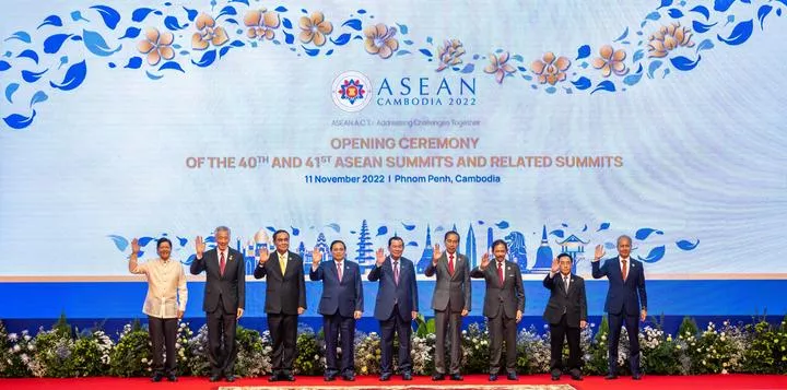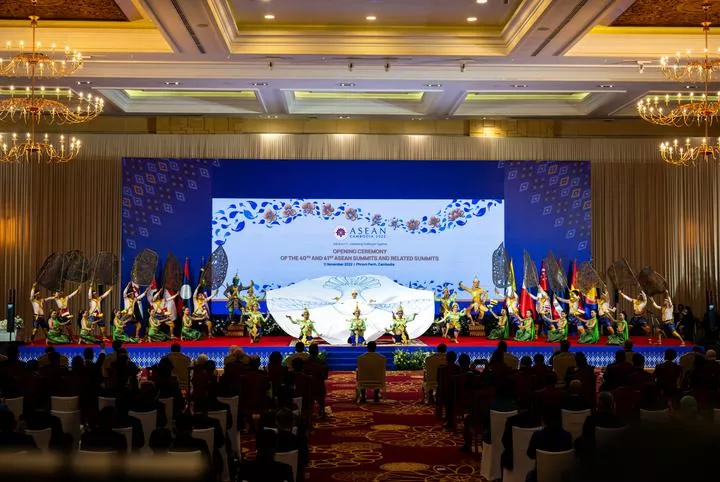 کمبوڈیا کے پنوم پن میں 40 ویں اور 41ویں آسیان سربراہی اجلاس اور متعلقہ سربراہی کانفرنس کی افتتاحی تقریب کے موقع پر (بائیں سے دائیں) فلپائن کے صدر فریڈینند روموالڈیز مارکوس ، سنگاپور کے وزیراعظم لی ہسین لونگ ، تھائی لینڈ کے وزیراعظم پریوت چن او چا ، ویتنام کے وزیراعظم پھام منہ چھنہ ، کمبوڈیا کے وزیراعظم سمڈیچ ٹیکو ہن سین ، انڈونیشیا کے صدر جوکو ویدودو ، برونائی کے سلطان حاجی حسن البلقیہ ، لاؤس کے وزیراعظم فانخام ویپھاوانا، ملائیشین پارلیمنٹ کے ایوان زیریں کے سپیکر اظہر عزیزان ہارون گروپ فوٹو کیلئے پوز دے رہے ہیں۔(شِنہوا)