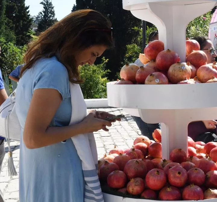 تیونس کے شمال میں واقع سیدی بو سعید میں انار ہفتے کی ایک تقریب میں لوگ انار دیکھ رہے ہیں۔ اس میں انار اور اس سے بنے پکوان کی نمائش کی جارہی ہے۔ (شِںہوا)