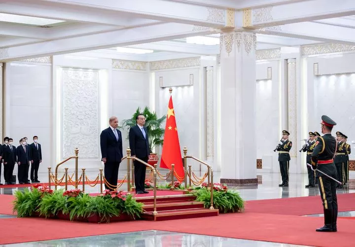 چین ، دارالحکومت بیجنگ کے عظیم عوامی ہال میں چینی وزیراعظم لی کھ چھیانگ، پا کستانی وزیراعظم محمد شہباز شریف کا خیرمقدم کررہےہیں۔ (شِنہوا)